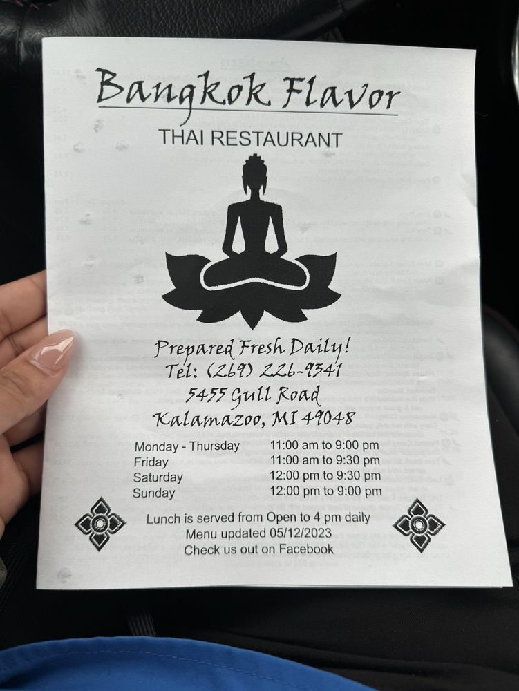 "Bangkok Flavor" is a Thai restaurant located at 5455 Gull Rd Ste B Kalamazoo, MI 49048. This casual and quiet spot offers a variety of menu options that cater to different preferences, including many vegetarian dishes. The restaurant also offers takeout, delivery, and catering services, making it a convenient choice for dining in or enjoying a meal at home. With a range of amenities such as outdoor seating, Wi-Fi, and happy hour specials, Bangkok Flavor provides a versatile dining experience. Whether you're looking to enjoy a meal with friends or family, this restaurant has something for everyone. With waiter service, beer and wine options, and a welcoming atmosphere, Bangkok Flavor is a great choice for lunch or dinner. Plus, the fact that they accept Apple Pay and credit cards makes the dining experience seamless and enjoyable. Overall, Bangkok Flavor is a must-visit for those craving authentic and delicious Thai cuisine in Kalamazoo.